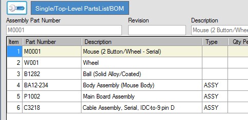The image to the right is still the same product that you saw on the previous page but in single level mode the BOM only shows the top level. If you processed this BOM then only the items at this level will be issued (their OnHand quantities would be adjusted/reduced)