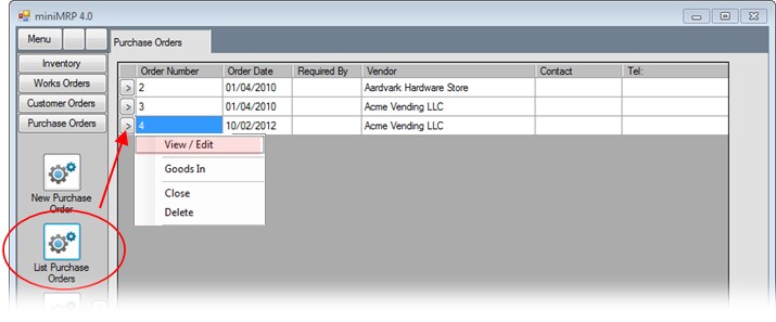 From the main menu select [List Purchase Orders] - we've circled it in the image below. and a list appears showing all purchase orders that have not been completed (orders that you have not received yet).