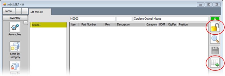 In the top right corner of the parts list editor you see a button with a 'Lock'. Click the lock to unlock the parts list. In the lower right corner of the Parts List Editor is the 'Insert' button - also circled in the image below
