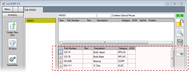 To the left of each row is a small [>] button - click that to select an item which will be inserted into the parts list. Selected items appear in the top half of the window (In the Parts List)- see the next page