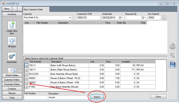Enter some text into the search box and click the search button. This brings up a list of all items where that text appears in the item description. To the left of each row is a small [>] button - see above - Click that button to add the selected item to the customer order.