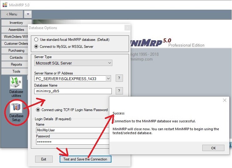 At the very top of the setup window select the option "Connect to MySQL or MSSQL Server" Next is 'Server Type'. Change the 'Server Type' to 'Microsoft SQL Server'. If MiniMRP and your SQL Server are both running on the same machine (or where your Windows users all login to Windows against a domain controller) you should be able to select the server name from the drop down 'Server Name' list and select the 'Windows Authentication' method allowing you to skip the login details username/password. In our example though we're making it a little more complicated by connecting to a remote machine running the free 'express' edition of SQL Server named named "SQLEXPRESS". Other 'non-express' versions of SQL Server often accept just the name of the machine where SQL Server is running but when connecting to remote instances of SQL Express or other named instances you usually need to give the machine name, the name of the sql server instance and the port number separated by \slash and ,comma in the format "MACHINE-NAME\SERVER-NAME,PORT-NUMBER" as shown in the image above. Click the 'Test and Save' button. If you've set everything up correctly you'll see the 'Success' message. If you see an error message instead then check your settings and try again. If necessary go back to Server Setup If setup correctly you can restart MiniMRP. Click the "About" button to confirm you've connected to your SQL server