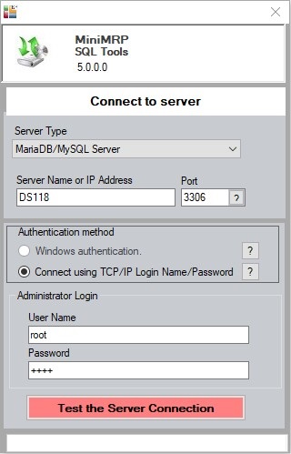 SQL Tools for MiniMRP.Restore a database from a previous version of MiniMRP (or create a new one)This stage assumes that your MariaDB/MySQL login/account has permission to create and administer databases. If you do not then you should first create/edit the login/account on your NAS device as explained in the Server Setup page. The MiniMRP program does not contain the tools necessary to create or restore SQL Server databases. We've done it that way so that remote or less experienced users of MiniMRP can not accidentally delete or restore a database on a Server. For that purpose we have a separate tool which you, as the system administrator, may wish to delete from users' computer after installation. MiniMRP usually installs in the folder Start the DBTools program. Be sure DBTools is version 5 or above - older versions can't connect to MariaDB/MySQL Servers.