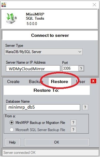 Note: If you do not have any previous version and this is a brand new installation of MiniMRP then instead of the 'Restore' option you can select the 'Create' to create a new empty database on your server.